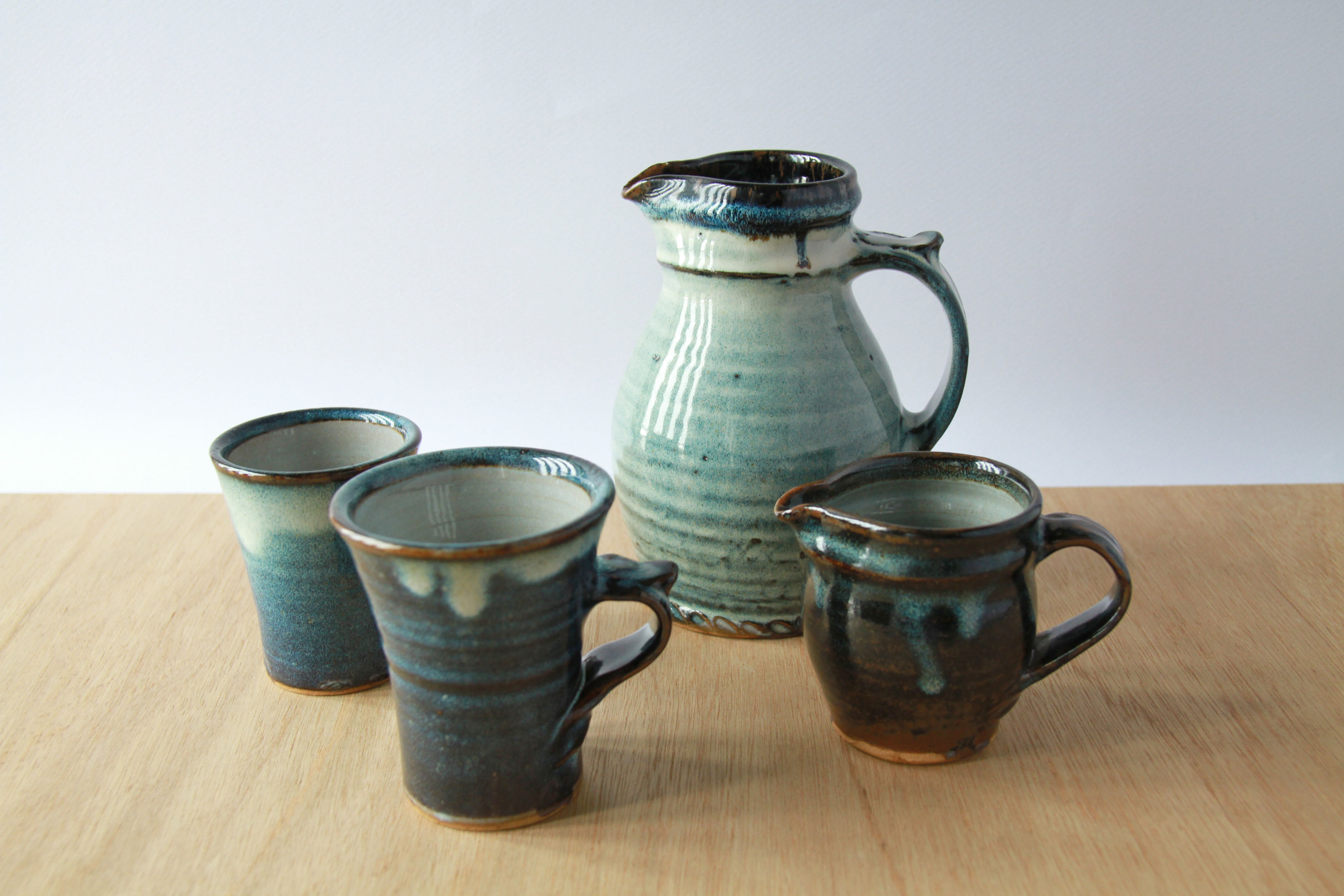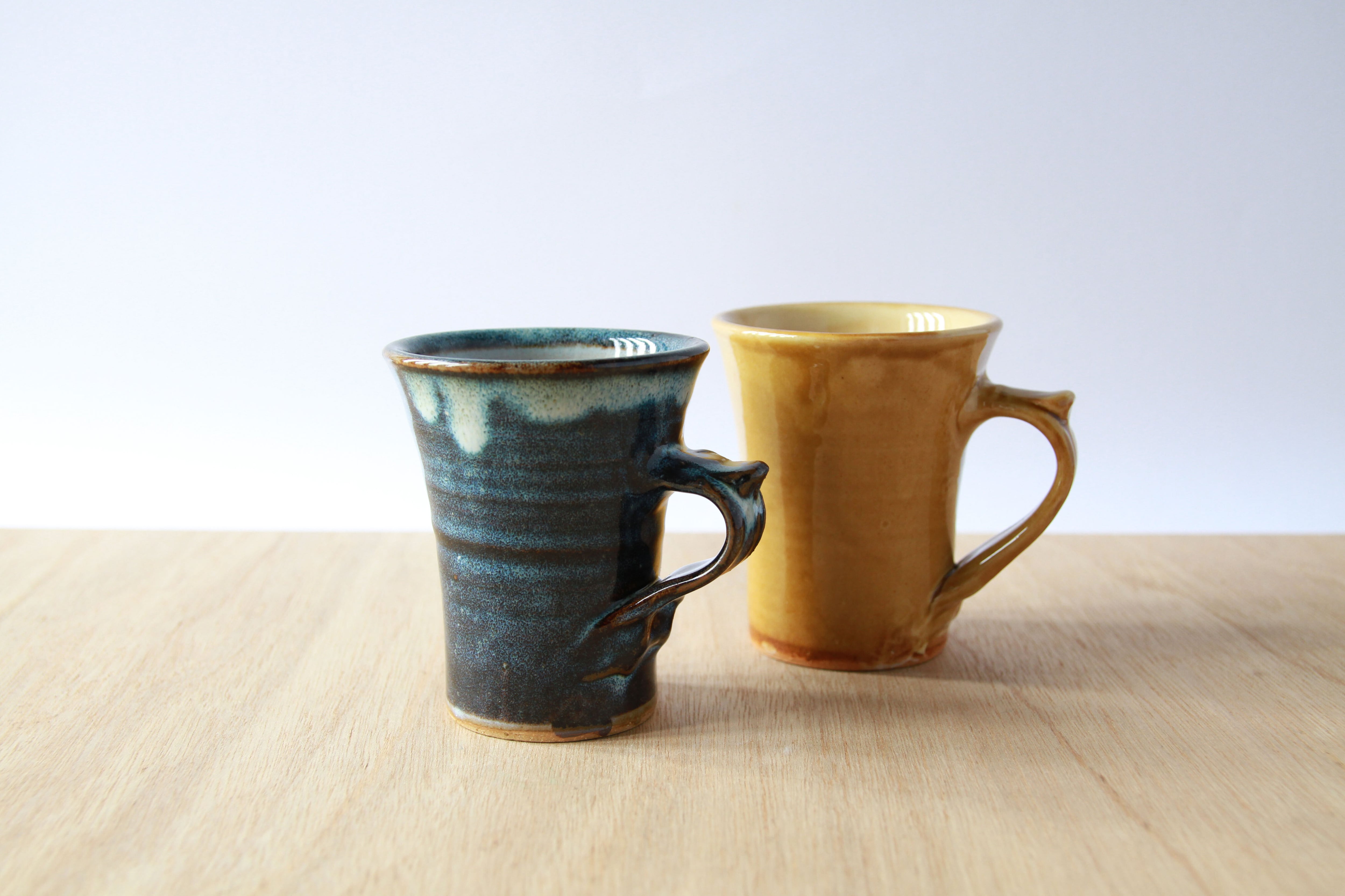 島根県内で産出された材料を用い、黄釉と呼ばれる釉薬を使った黄色い器と海鼠釉と呼ばれる釉薬を使った青い器を作っています。