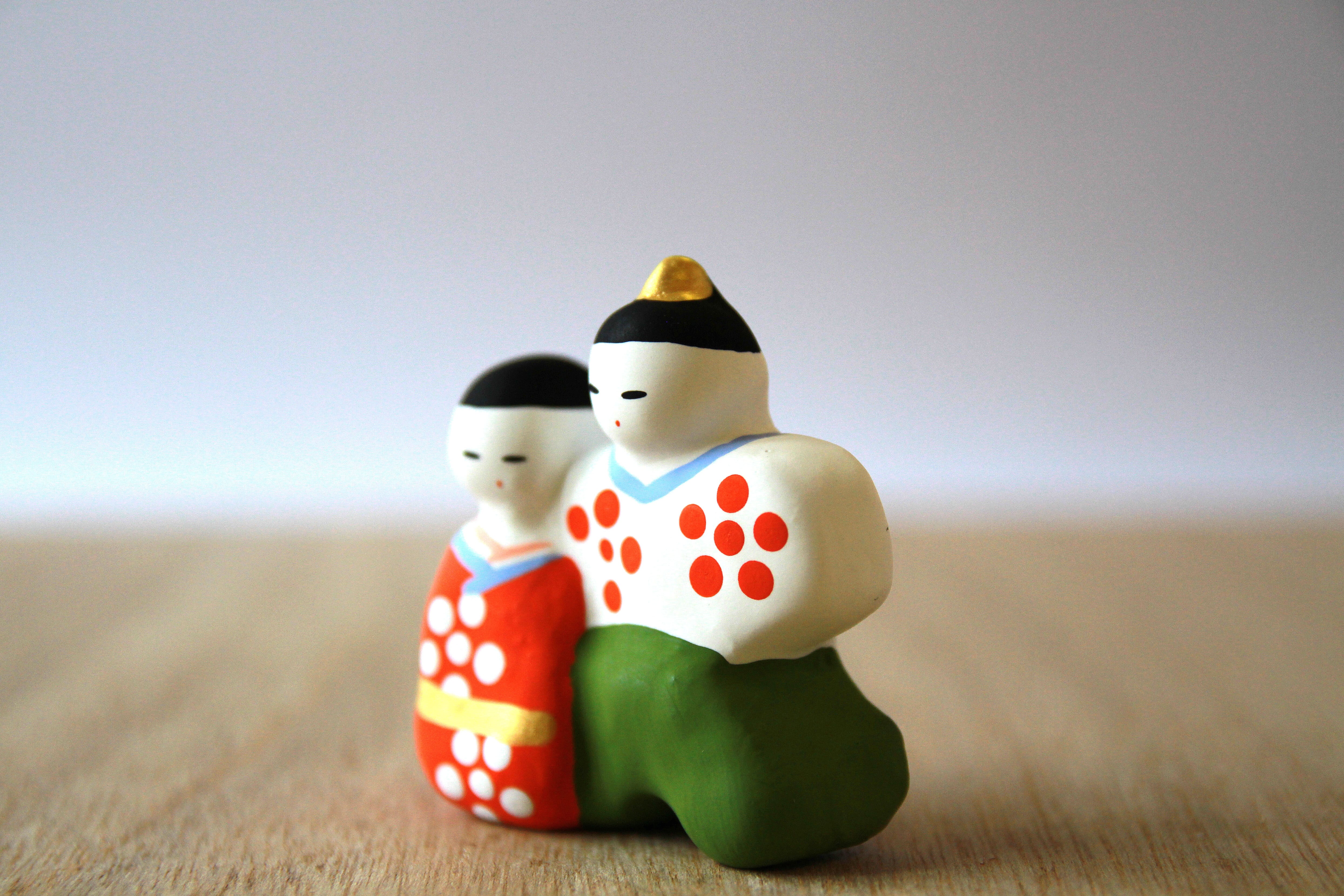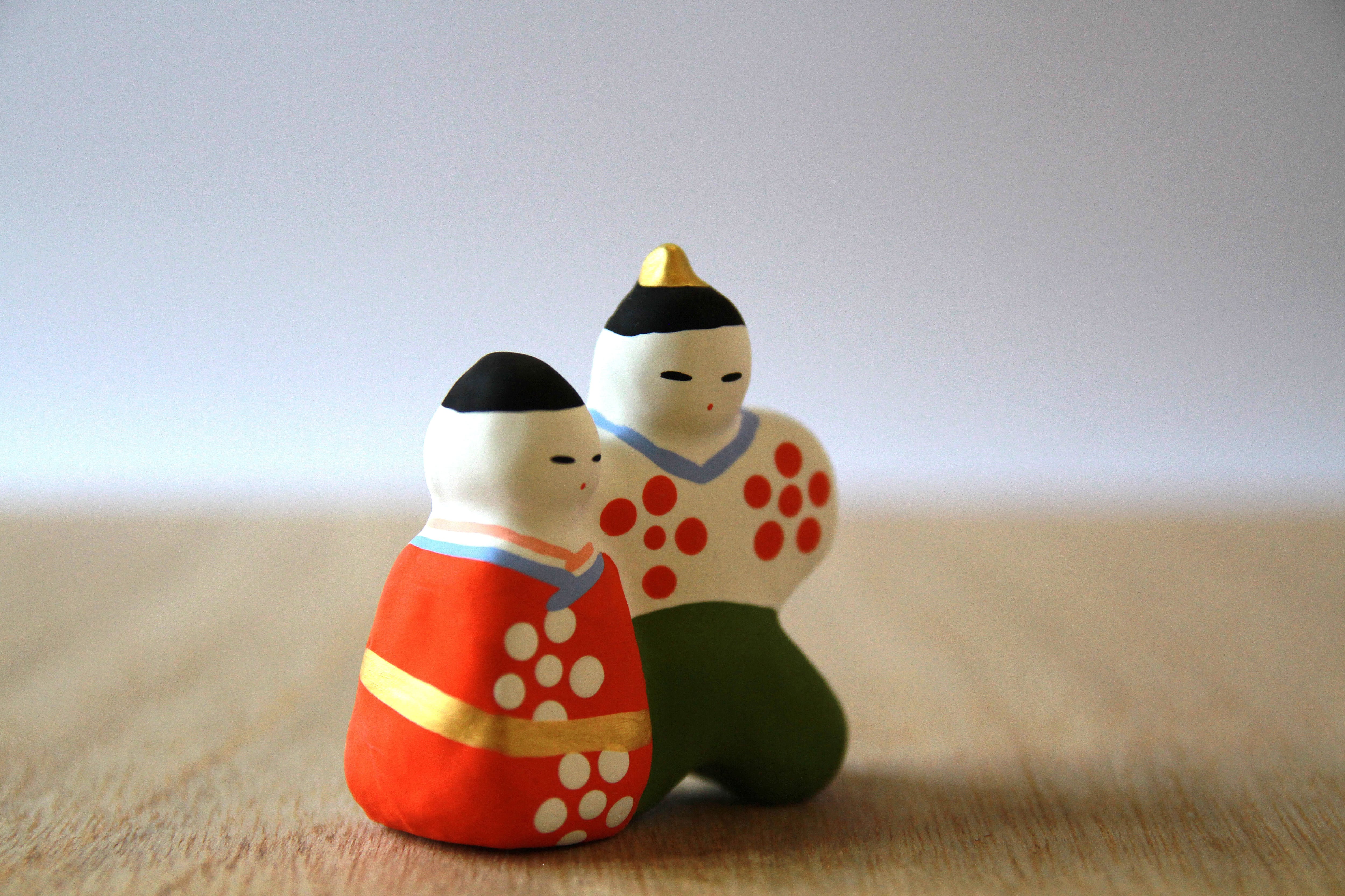 鳥取県に伝わる流しびなをモチーフに創作した土人形です。流しびなと同じ梅花の模様を着物に描いています。また、着物の色に赤、白、緑の3通りの組み合わせがあります。